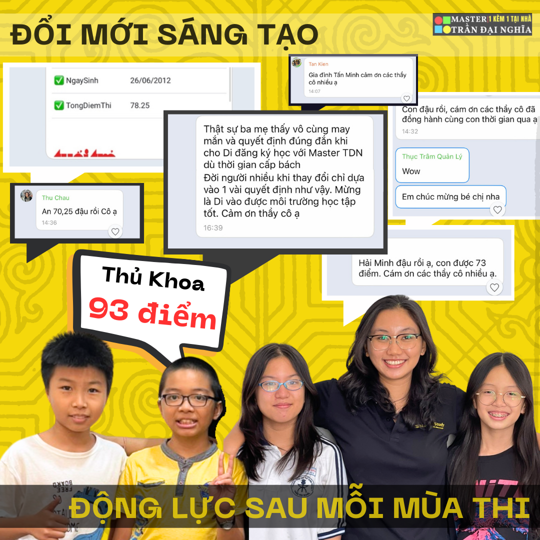 Tại Master Trần Đại Nghĩa, luôn quán triệt tinh thần đổi mới sáng tạo mỗi ngày và hướng tới sự hoàn hảo. Các thành tích xuất sắc của học sinh qua các mùa thi là thành quá của những nỗ lực không ngừng cải tiến để khiến những điều nhỏ bé nhất trở nên tốt hơn.